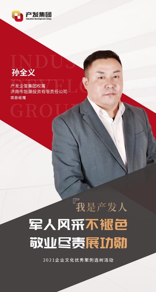 孫全義,現(xiàn)任產(chǎn)發(fā)企管集團(tuán)權(quán)屬濟(jì)南市能源投資有限責(zé)任公司(以下簡稱“能投公司”)項目經(jīng)理。2001年參軍,在部隊期間刻苦訓(xùn)練,聽黨指揮,服從命令。2003年他從部隊光榮退役,隨后加入能投公司。期間曾借調(diào)至濟(jì)南市發(fā)改委幫助工作,現(xiàn)負(fù)責(zé)能投公司的資產(chǎn)管理工作。
