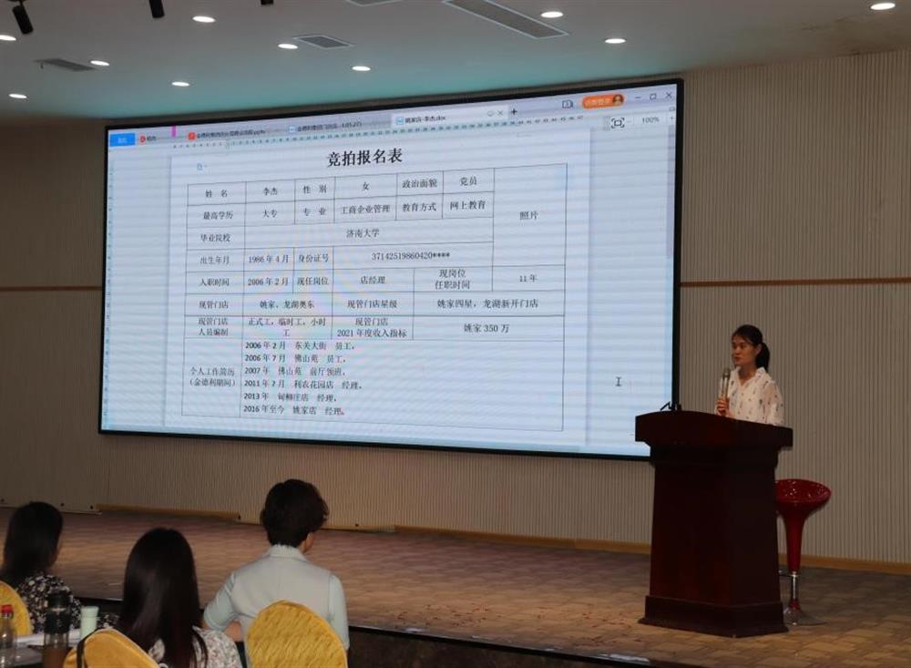 公司成立競拍領(lǐng)導(dǎo)小組,堅持“公開競拍、平等競爭、擇優(yōu)錄取、注重實(shí)績”的原則,鼓勵員工毛遂自薦、積極報名。競拍店長依次上臺分別從管理門店2021年度經(jīng)營收入目標(biāo)、競拍上崗后的工作思路、設(shè)想及經(jīng)營措施等方面進(jìn)行演講。